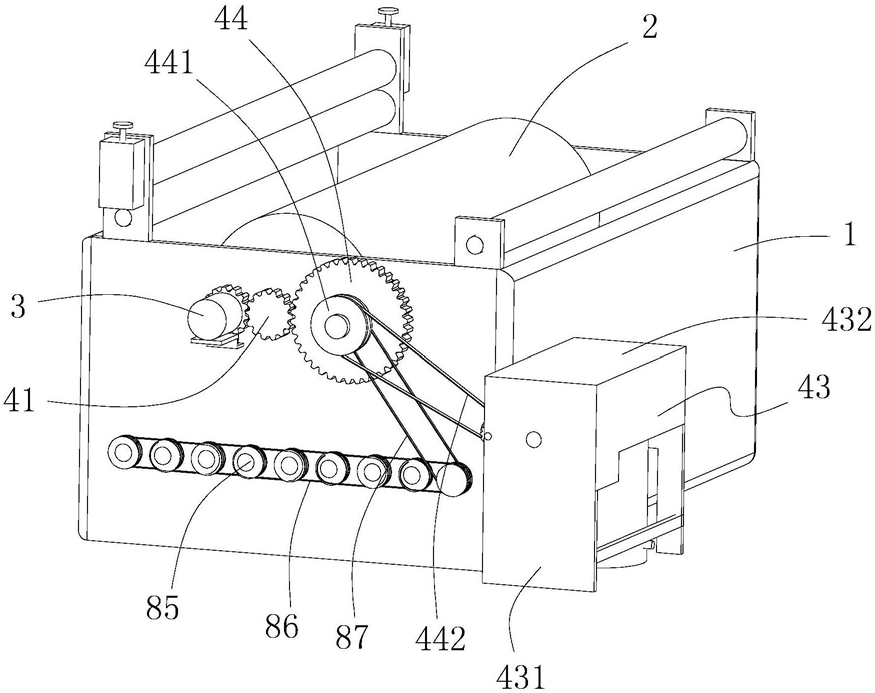 4.根据权利要求3所述的用于蓝印花布均匀染色的设备,其特征在于:所述变速部件包括与所述齿轮件传动配合的第一变速齿轮(44)、与该第一变速齿轮通过传动部件相连的驱动齿轮(45)及与该驱动齿轮传动连接的第二变速齿轮(46);所述第一变速齿轮(44)的半径为齿轮件(41)的3-5倍,所述第二变速齿轮(46)的半径为驱动齿轮(45)的3-5倍;所述撑架(43)包括撑脚(431)和设于该撑脚上的箱体(432),该箱体内设有定位板(433),所述驱动齿轮(45)上设有定位轴(451),所述第二变速齿轮(46)上设有限位轴(461),该定位轴和限位轴均为一端可转动的穿设于箱体(432)内壁上,另一端穿过所述定位板(433)。