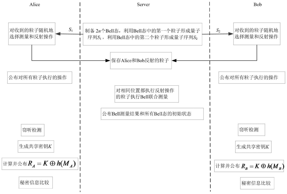 半可信的第三方服务器只保留第一通信方和第二通信方同时采用反射操作的粒子对,并使用Bell基进行联合测量;半可信的第三方服务器再公布测量结果和所有Bell态的初始状态;