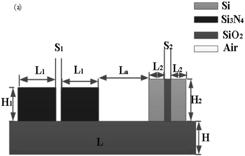 4.根据权利要求1所述的1530nm到1580nm波段范围内的双槽型大负色散波导,其特征在于,所述的右侧沟槽波导在水平方向上的高折射率夹板层长度为L2=137nm,垂直方向上高折射率夹板层的高度H2=422nm,所述的右侧沟槽波导在水平方向上低材料折射率槽芯长度为S2=58.5nm,垂直方向上低材料折射率槽芯高度H2=422nm。