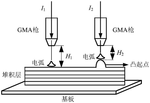 1.一种基于电流传感的交叉路径金属构件GMA增材制造方法,其特征在于,在交叉路径金属构件GMA增材制造过程中,采用电流传感器实时检测所有堆积路径上GMA电弧的电流变化曲线,计算机控制系统根据检测电流与设定电流的偏差及该偏差的变化趋势,控制堆积路径上的GMA枪行走速度或工作平台的行走速度,从而实时调节堆积路径及交叉路径点处的金属丝材填充量,实现交叉路径金属构件GMA增材制造堆积路径及路径交叉点成形的控制。