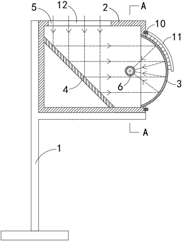 1.一种聚光型自清洁道路反光镜,包括支架(1),所述支架(1)的上端固定连接有壳体(2),所述壳体(2)的侧壁上设有开口,所述开口内固定连接有凸面反光镜(3),其特征在于,所述壳体(2)内固定连接有倾斜设置的平面反光镜(4),所述平面反光镜(4)与壳体(2)的内底面呈45度夹角,所述壳体(2)的上侧壁设有进光口(5),所述凸面反光镜(3)的凹面处设有反光层,所述壳体(2)内固定连接有水平设置的储液筒(6),所述储液筒(6)的轴线贯穿凸面反光镜(3)凹面的焦点处,所述储液筒(6)内密封滑动连接有活塞块(7),所述活塞块(7)与储液筒(6)形成的密闭空间内填充有蒸发液,所述活塞块(7)的另一侧壁上固定连接有传动条(8),所述壳体(2)的内侧壁上设有与传动条(8)相匹配的弧形滑动槽(9),所述传动条(8)位于储液筒(6)外的部分位于弧形滑动槽(9)内并与弧形滑动槽(9)滑动连接,所述壳体(2)的外侧壁上转动连接有永磁环(10),所述永磁环(10)与传动条(8)相互吸引,所述凸面反光镜(3)的表面设有与其相匹配的清灰刷(11),所述清灰刷(11)与永磁环(10)固定连接。