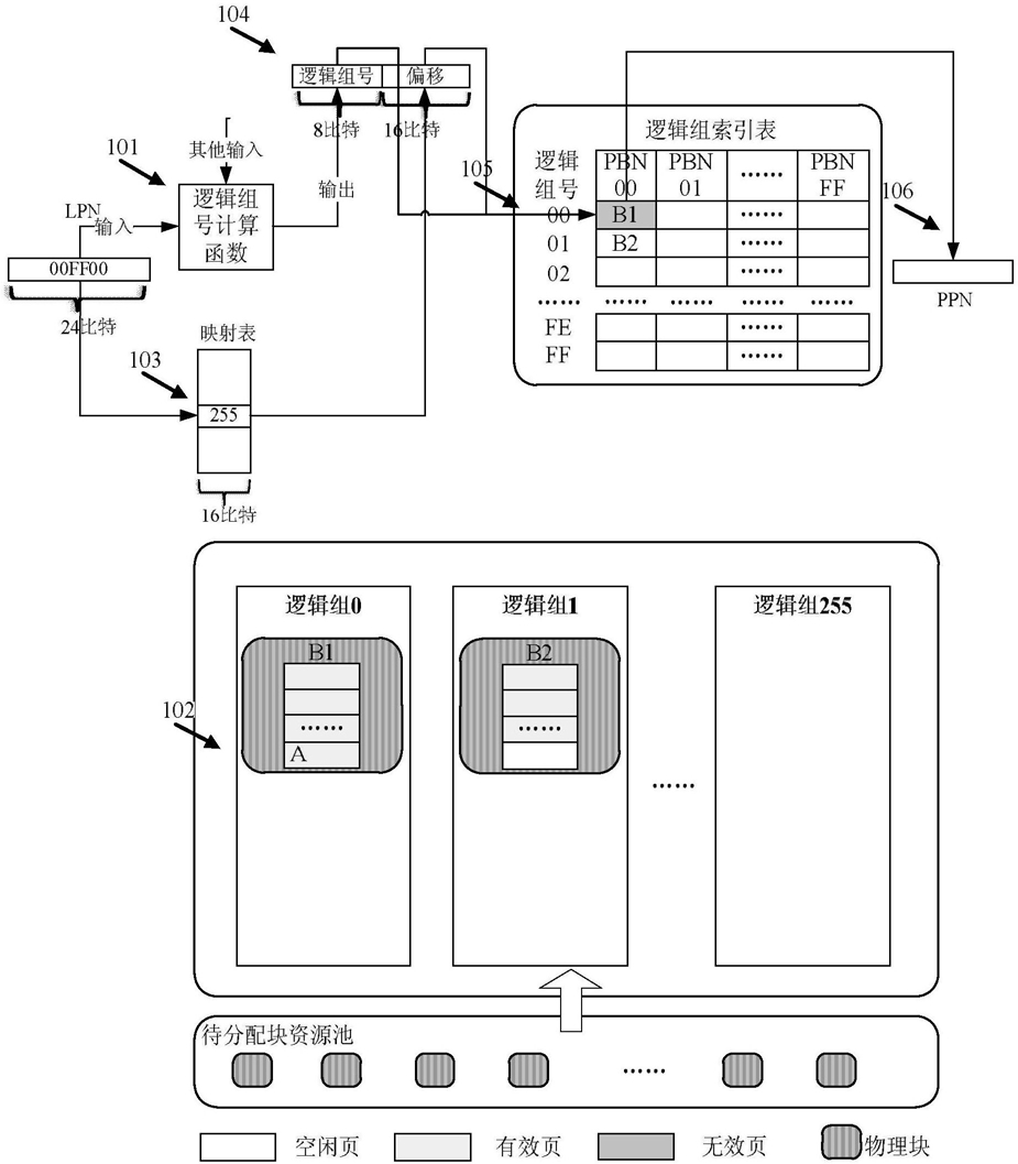 当物理块被分配至逻辑组之后,该物理块不允许再被分配;而在该物理块被垃圾回收之后,该物理块允许再次分配至其他逻辑组;基于计算的FTL地址映射机制,步骤如下: