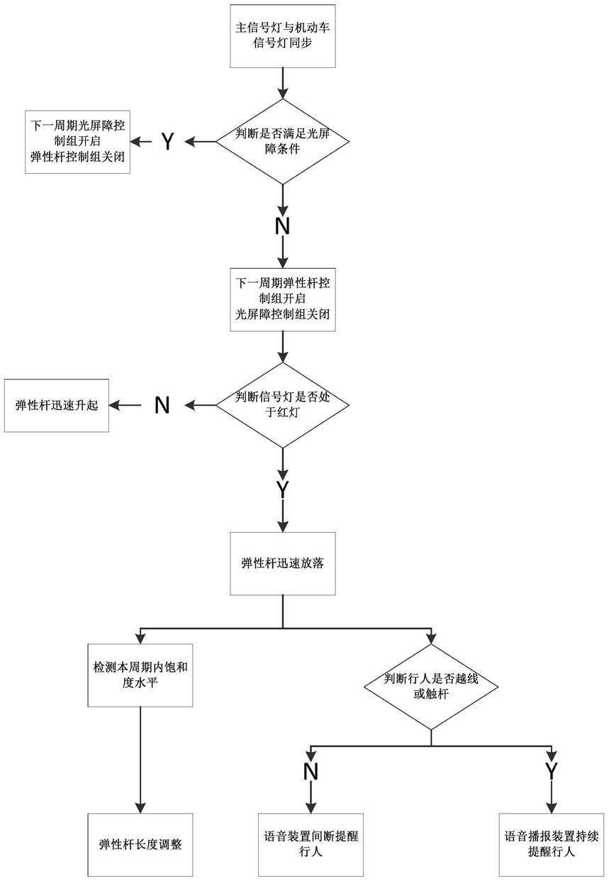 当处于平面交叉口信号灯开启时段时,光杆人行横道信号灯随机动车信号灯变化而变化,同时亮度检测模块开启,判断当前光照亮度是否超过设定阈值,若超过则启用弹性杆控制组,否则,开启光屏障控制组;
