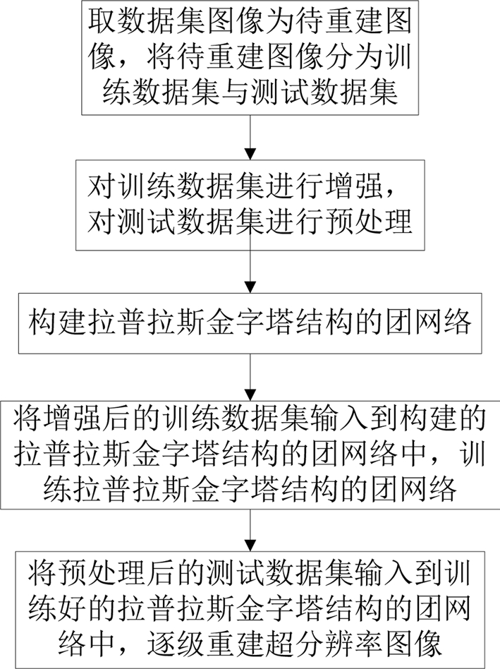2.根据权利要求1所述的一种拉普拉斯金字塔结构的团网络超分辨率图像重建方法,其特征在于:所述步骤2中,对训练数据集进行增强包括以下步骤:步骤2.1.1:将训练数据集中的图像以α的倍数进行缩放、以β角度进行旋转、以γ的概率进行水平翻转及垂直翻转,得到处理后的图像;α>0,0<β<360°,0<γ<1;