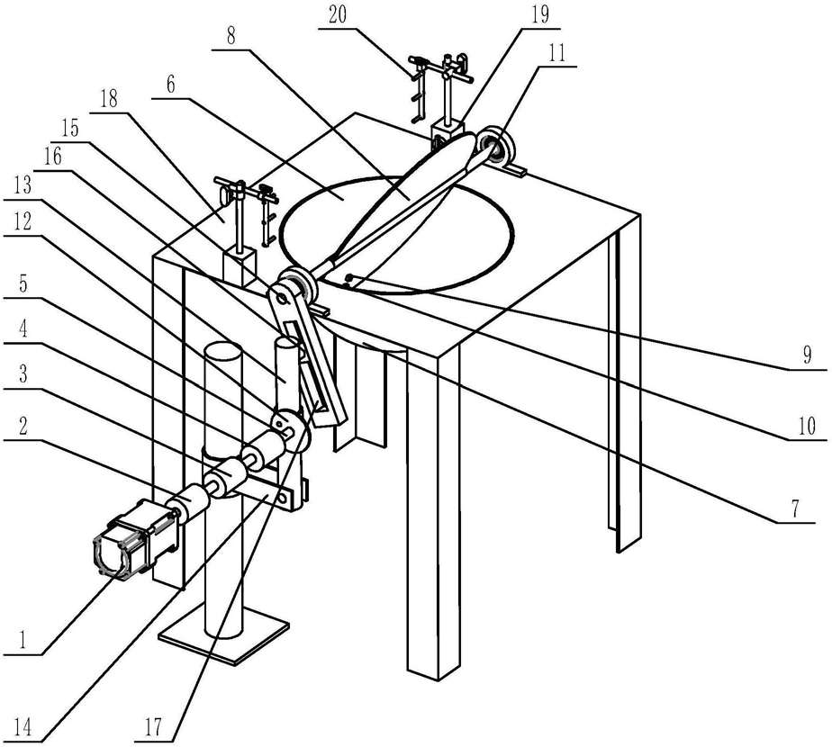 其特征在于:所述炒茶机,包括机架(18)、高度检测装置、电机(1)、第一联轴器(2)、扭矩传感器(3)、第二联轴器(4)、传动轴(11)、炒锅(6)、电热丝(7)、炒板(8)、速度传感器(9)和温度传感器(10),所述电机(1)和炒锅(6)均固定在机架(18)上,所述电机(1)的输出轴(5)依次连接第一联轴器(2)、扭矩传感器(3)和第二联轴器(4),第二联轴器(4)的输出轴(5)通过曲柄摇杆机构连接传动轴(11),炒板(8)固定在传动轴(11)上,炒板(8)下半部分的形状为与炒锅(6)形状相配合半圆形,电机(1)运动时通过第一联轴器(2)、扭矩传感器(3)带动第二联轴器(4)的输出轴(5)转动,进而通过曲柄摇杆机构带动炒板(8)绕着传动轴(11)在炒锅(6)内往复摆动;所述温度传感器(10)和速度传感器(9)固定在炒板(8)底部靠近炒锅(6)的位置,电热丝(7)均匀分布在炒锅(6)的锅底;所述高度检测装置包括万向磁力表座(19)和激光探头(20),万向磁力表座(19)安装在炒锅(6)旁的机架(18)上且设置有一对,每个万向磁力表座(19)上均安装有三个激光探头(20),两个万向磁力表座(19)上的三个激光探头(20)位置一一对应,相对两个激光探头(20)的相对方向为炒板(8)翻炒茶叶时茶叶的腾空方向,且三个激光探头(20)从上至下依次布置在万向磁力表座(19)上;激光探头从上至下依次为第一探头、第二探头和第三探头;