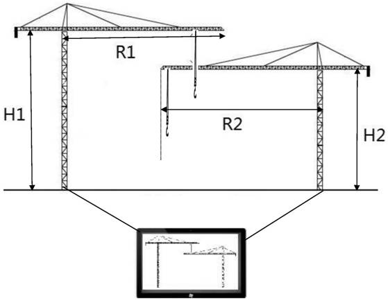 横臂高度比较单元模块,比较H1和H2,将横臂高度较低的建筑施工塔吊机确定为低高度塔吊机,将横臂高度较高的建筑施工塔吊机确定为高高度塔吊机;
