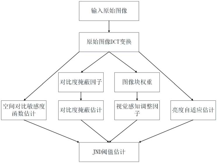 9.根据权利要求1所述的一种恰可察觉失真模型阈值计算方法,其特征在于,所述DCT域的JND阈值通过如下公式获得:JND阈值=视觉感知调整因子×空间对比敏感度函数模块值×亮度自适应模块值×对比度掩蔽模块值。