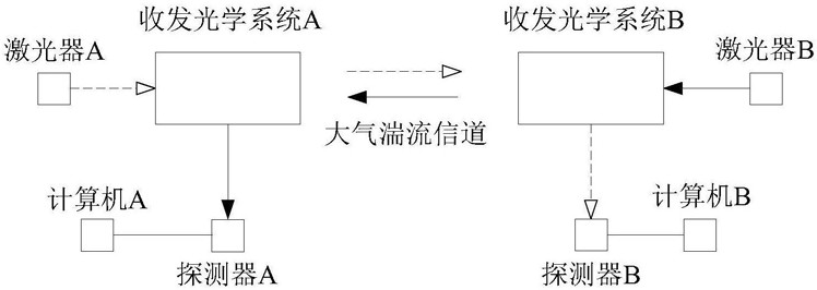 需要激光收发端机A和激光收发端机B,激光收发端机A和激光收发端机B相互通视;激光收发端机A包括激光器A、收发光学系统A、探测器A和计算机A;激光收发端机B包括激光器B、收发光学系统B、探测器B和计算机B;激光器A发出的激光信号A001经收发光学系统A发射到大气湍流信道中,激光信号A001到达收发光学系统B后再入射到探测器B上;激光器B发出的激光信号B001经收发光学系统B发射到大气湍流信道中,激光信号B001到达收发光学系统A后再入射到探测器A上;计算机A实时采集探测器A输出的电信号,计算机B实时采集探测器B输出的电信号;