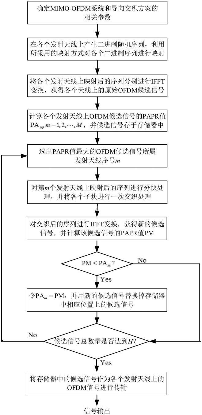 每次交织处理之前,均要比较各个发射天线上现存的候选信号的PAPR值,然后对PAPR值最大的候选信号所在天线进行交织处理进而产生新的OFDM候选信号;