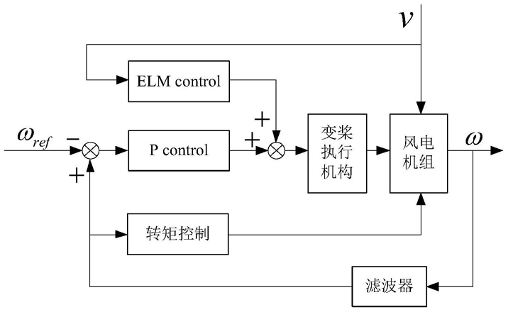 阶段2:将训练好的极限学习机用于变桨距控制,风速信号作为极限学习机的输入,极限学习机的输出即为PI控制器稳态值输出,为加快风电机组由暂态到稳态的过程,将风轮实际转速ω与风轮额定转速ωref相减,经比例控制器调节,输出信号再与极限学习机的输出相叠加,最后的叠加信号进入变桨距执行机构进行变桨控制,由此来稳定风轮的转速,同时保持发电机转矩恒定,实现风电机组的输出功率稳定。