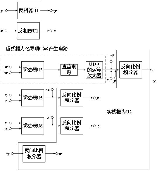 构成;乘法器U6输出的‑x项与z项加至集成运算放大器芯片U2中第三放大器,通过反向运算、比例运算与积分运算实现z项的输出;
