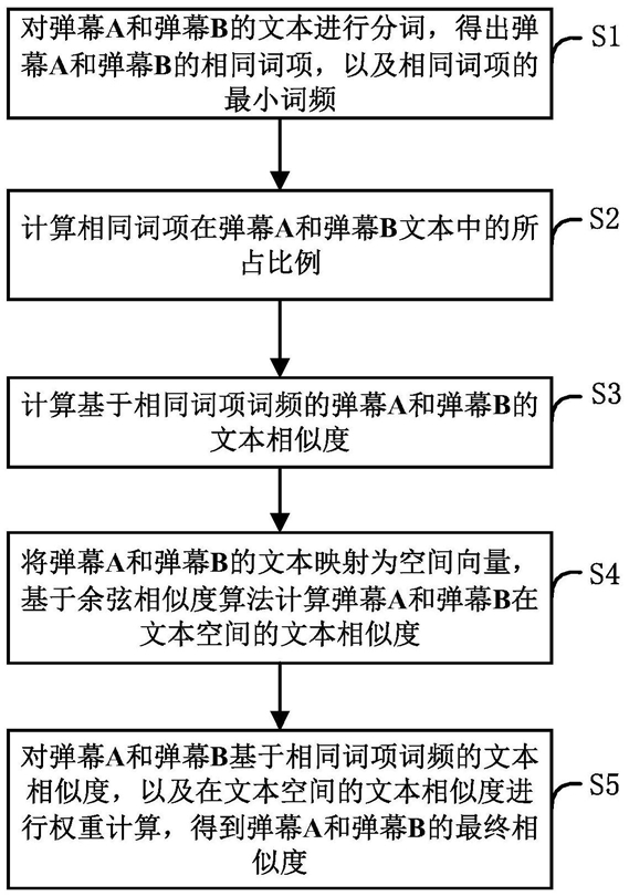 最终相似度计算模块,其用于对弹幕A和弹幕B基于相同词项词频的文本相似度,以及在文本空间的文本相似度进行权重计算,得到弹幕A和弹幕B的最终相似度。