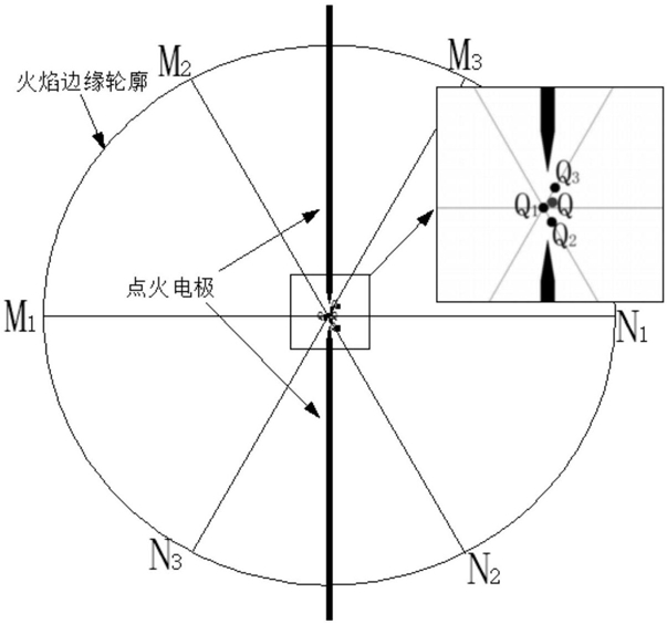 步骤21:在所述火焰边缘轮廓图中,以点火电极连线所在的直线为基准线,在基准线左右两侧的火焰前锋面上分别确定一个离基准线最远的像素点M1和N1,以M1和N1两点的连线的中点作为初始半径测量中心Q1;