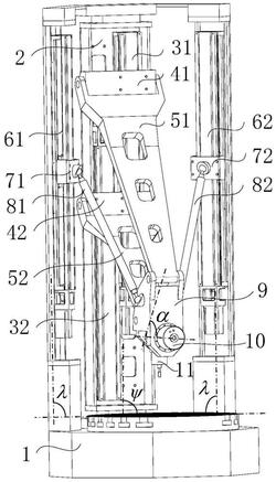 所述机架支撑杆与所述机架对称面的夹角β为0°60°,所述机架支撑杆与所述底平台~加工面的夹角λ为60°90°;