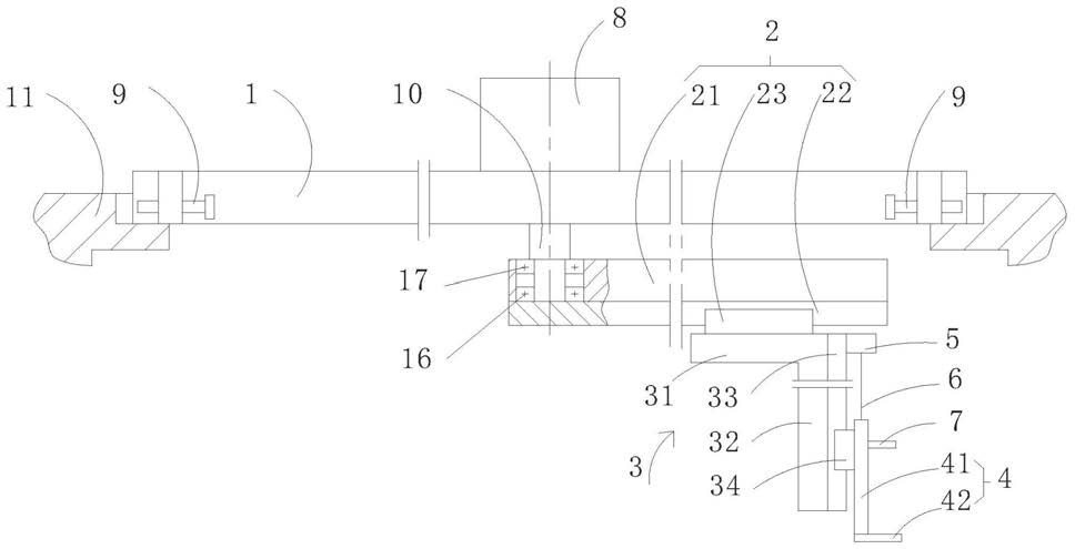 移动架,水平滑动设置在所述旋转组件上;所述移动架包括:连接部,固定在所述第一滑块上;