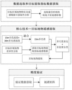 所述的步骤(3)具体包括以下步骤:先在30米分辨率遥感数据上应用非监督分类将目标区域分为目标地物和其它地物两类,然后应用所提取的目标地物区域掩膜15米的遥感数据,并在掩膜后的遥感数据上,应用非监督分类再次分为目标地物和其它地物两类,此时,提取的目标地物为最终提取结果;