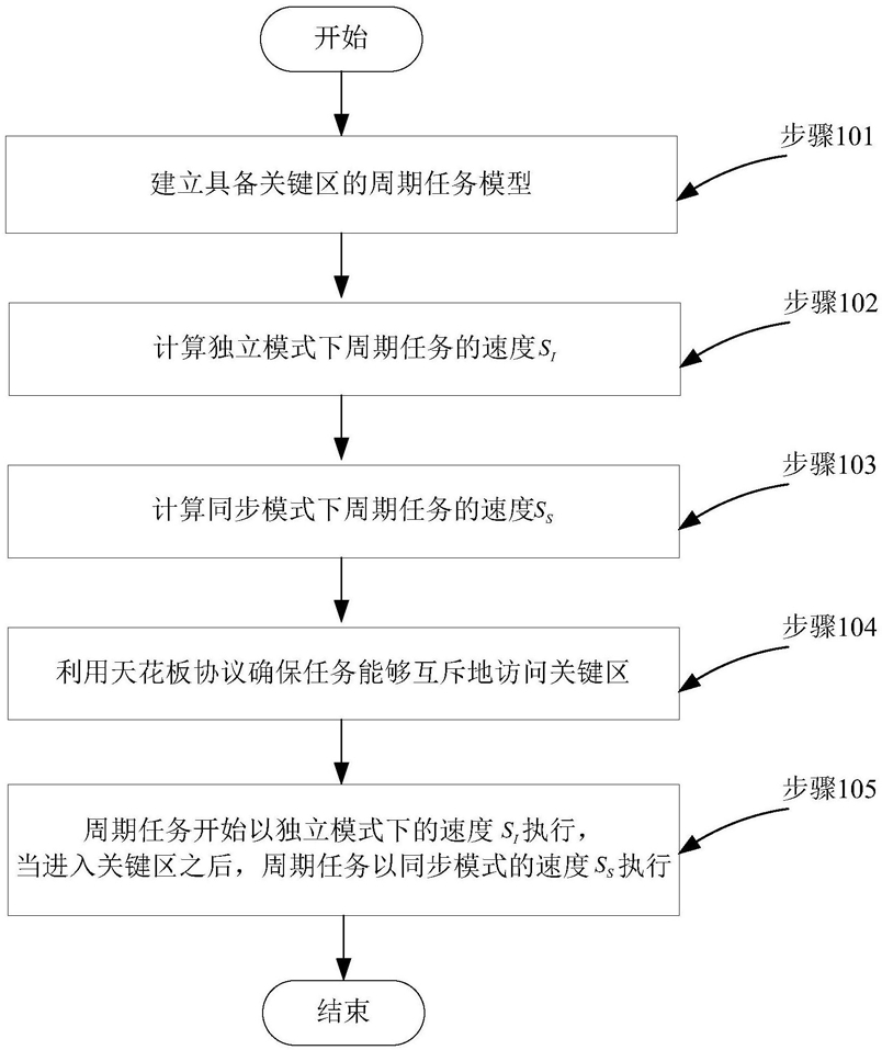 所述周期任务开始以独立模式下的速度SI执行,当其进入关键区之后,周期任务以同步模式的速度SS执行,包括:周期任务开始以独立模式下的速度SI执行,当进入关键区之后,周期任务以同步模式的速度SS执行;此时周期任务继承使用该关键区任务的最大优先级,并且将所有使用该关键区的其它周期任务阻塞;只有该周期任务退出关键区之后,其它使用该关键区的周期任务才可以执行,并且以同步模式的速度SS执行。