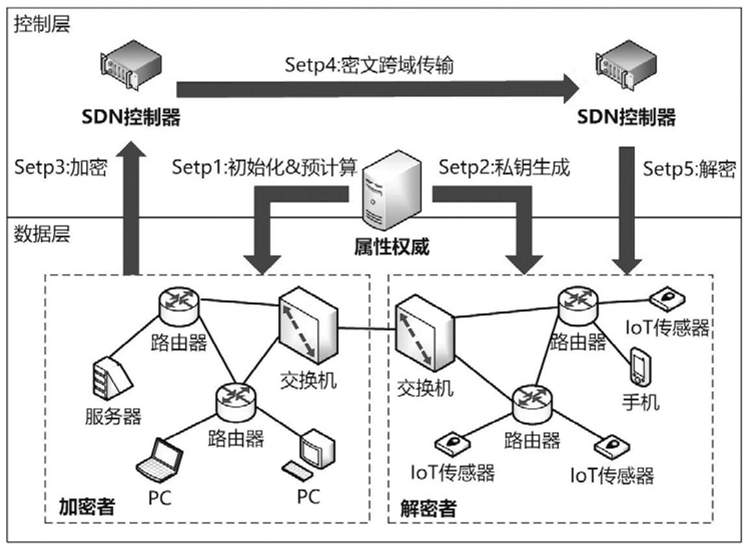 1.一种抗密钥暴露属性加密的SDN跨域访问控制方法,其特征在于:基于属性权威、SDN控制器、加密者和解密者四部分构成的控制系统,属性权威和SDN控制器位于控制层,加密者和解密者位于数据层,属性权威是一个可信的权威机构,负责所有属性的认证以及公钥、私钥的发布;SDN控制器负责收集、存储和管理SDN流表、路由以及数据量信息,SDN采用多控制设置,将SDN划分为多个SDN域,每一个域内部署唯一的SDN控制器,每个SDN控制器管理各自域内的重要信息,同时负责与其他域的SDN控制器交互;加密者是数据的初始拥有者,包括路由器、服务器、PC机和交换机构成的用户或SDN设备,用户或SDN设备能够上传自己的数据并根据自己的意愿或需求自由制定相应的访问策略;解密者是试图获取SDN控制器内信息的用户或者设备,其身份用一个属性集合来表示,解密者拥有一个与其属性集合相对应的私钥,并通过私钥来解密密文,解密者包括路由器、loT传感器、手机和交换机;包括以下步骤:第一步:启动访问控制系统,属性权威调用初始化算法,输入一个安全参数k,生成公钥PK和主密钥MSK,公钥PK向全网公开,主密钥MSK由属性权威秘密保存;