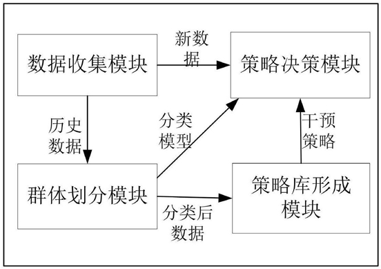 1.一种在线学习干预系统,其特征在于,包括数据收集模块、群体划分模块、策略库形成模块,数据收集模块的数据输出端连接群体划分模块的数据输入端,群体划分模块的数据输出端连接策略库形成模块的数据输入端;