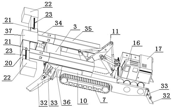 1.可调节重心的破岩机,其特征在于,对称的右边梁、左边梁的前后端分别与前连接梁(3)、后连接梁(2)连接构成上下中空的车体,后连接梁上有控制室(16),动力室(17),后连接梁的前端板与岩石臂(11)连接,岩石臂(11)在车体中空区域内进行破岩作业,岩石臂(11)搭载有一个斗齿的松土器,松土器由油缸驱动,车体两侧的左边梁(6)和右边梁(10)沿纵向设置对称的左右纵向伸缩筒(35),纵向伸缩筒(35)与纵向伸缩块(34)滑动配合,纵向伸缩块(34)一端位于纵向伸缩筒(35)内,另一端位于纵向伸缩筒(35)外与车体前部设置的配重(22)直接或间接连接。