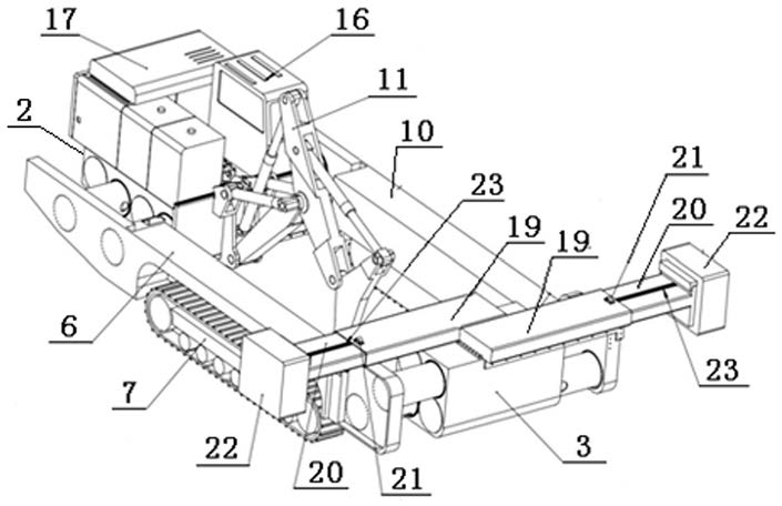 2.配重可横向移动的破岩机,其特征在于,对称的右边梁6、左边梁10的前后端分别与前后连接梁3、2连接包构成上下中空的车体,后连接梁2上有控制室(16),动力室(17),后连接梁2的前端板与岩石臂(11)连接,岩石臂(11)在车体中空区域内进行破岩作业,岩石臂(11)搭载有一个斗齿的松土器,松土器由油缸驱动,第1、2伸缩筒(19分别与右边梁6、左边梁10固定连接,第1、2伸缩块(20)分别与第1、2伸缩筒(19)滑动配合,伸缩块(20)一端位于伸缩筒(19)内,另外一端位于伸缩筒(19)外,伸缩筒(19)有第1伸缩驱动装置,(21)与伸缩块(20)传动连接,可驱动伸缩块(20)作伸缩运动,伸缩块(20)外搭载有配重(22)。