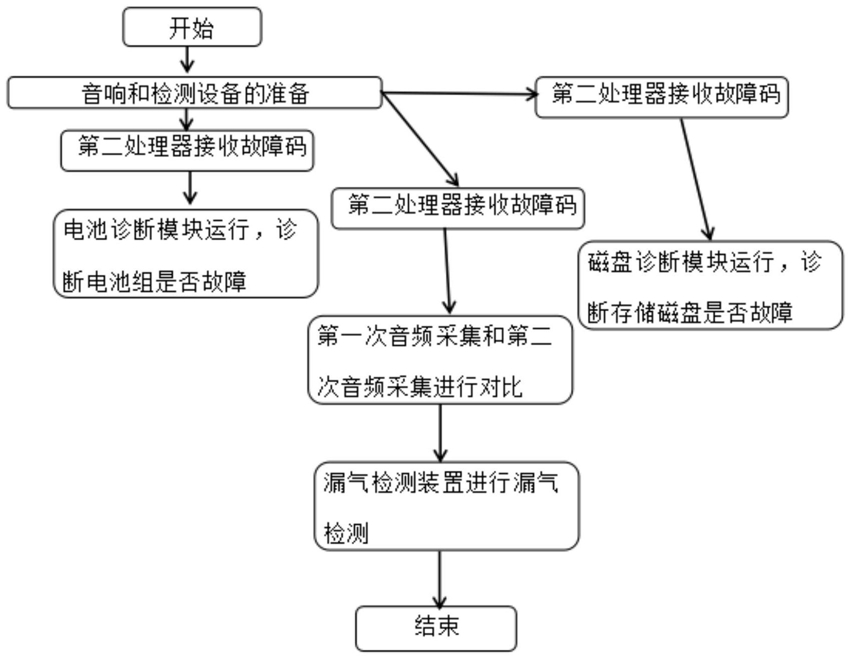4.根据权利要求3所述的一种音响系统的故障诊断系统,其特征在于:所述故障诊断系统还包括漏气检测装置,所述漏气检测装置包括压力检测器,所述压力检测器检测音响内部压力值,所述压力检测器与接收单元电连接;所述第二处理器还包括压力对比单元,所述接收单元、压力对比单元、存储单元依次电连接,所述接收单元、压力对比单元、显示单元依次电连接。