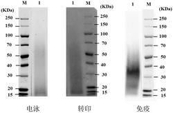8)转印:裁剪一张尺寸大于凝胶的PVDF膜,一角做标记,用甲醇浸泡0.5‑1.5 min进行活化处理后,将膜与海绵片、滤纸一起放在转印缓冲液中浸泡20‑40 min,而后按照“海绵片—滤纸—凝胶—PVDF膜—滤纸—海绵片”的顺序,搭建转印“三明治”,并将其放入转移装置中,倒入转印缓冲液后,在冰浴条件下200 ‑300 mA恒流转印1.5‑2 h,转印完成后,将膜取出,放入化学发光仪中观察转印情况;