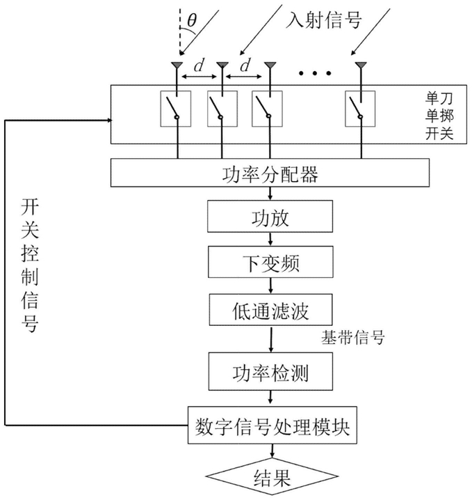 步骤2:每个阵元均与单刀单掷开关模块相连,开关的通断由数字信号处理模块控制,通过开关通断,实现对接收信号的调制,将产生新的频率分量;假设开关周期为T,则每路开关的导通时间为τ=T/N;第n个开关的控制信号Un(t)可以表示为:其中τn,ON为第n个开关的导通时刻,k为功率计在进行功率估计时需要用到的调制周期T的个数;在扫描的初始, 为了避免谐波分量混叠,调制信号频率Fm=1/T大于待测信号带宽;