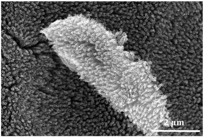 4)高温氮化:将经过退火的钛铌合金置于氨气气氛中进行高温氮化,即在钛铌合金表面得到氮化钛铌纳米管阵列。
