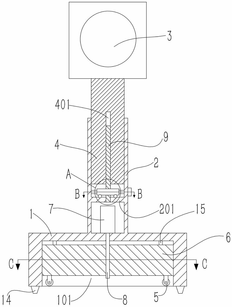 2.根据权利要求1所述的装有可升降式轮子的移动交通信号灯,其特征在于,所述套管(2)内设有水平板(201),所述水平板(201)上沿竖直方向转动连接有调节螺杆(9),所述撑杆(4)上设有与所述调节螺杆(9)相互配合的螺纹孔B(401);所述调节螺杆(9)上安装有蜗轮(10),所述套管(2)上设有与所述蜗轮(10)啮合的蜗杆(11)。