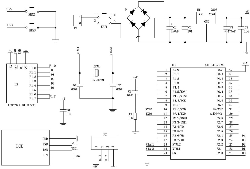 4.根据权利要求1所述的基于语音语义训练的脑瘫康复机器系统,其特征在于:还包括稳压电路,由自锁按键、桥式整流器、470uF电解电容,104独石电容,7805稳压器组成,7805稳压器的3条引脚Vin输入端,GND接地;独石电容通过的交流电是有规律的转向从而实现两头带电,在电路中和其余元器件并联。