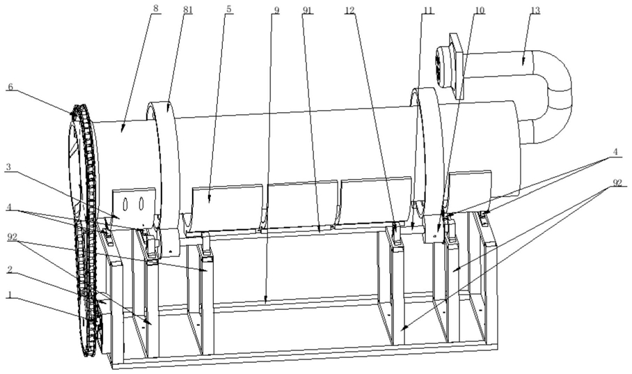 1.一种茶叶杀青机,包括支架、设于支架上的回转滚筒、支撑回转滚筒的托轮组件、驱动回转滚筒转动的旋转电机,所述回转滚筒的两端分别设有进口和出口,所述回转滚筒的内壁上设有螺旋状分布的导叶板,其特征在于:所述回转滚筒的外圆面下方沿轴向间隔分布有分段加热的加热板,所述旋转电机通过链传动驱动回转滚筒,该茶叶杀青机还设有将回转滚筒内的水汽排出的除湿装置。