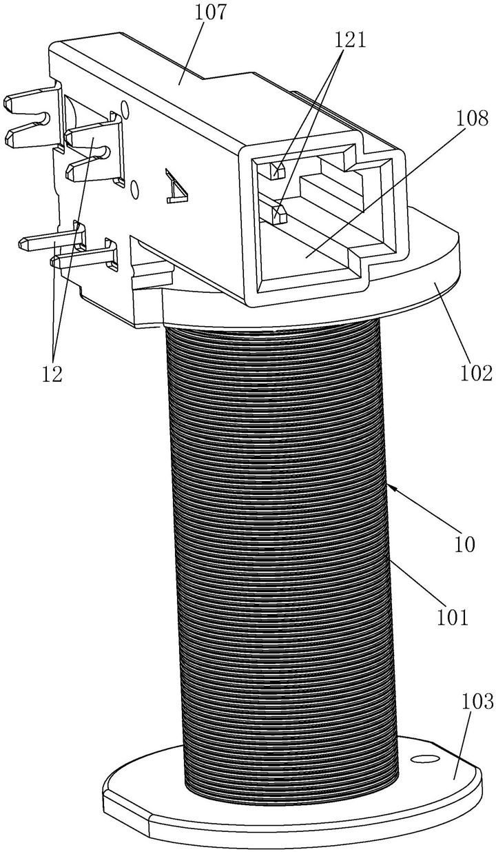 1.一种线圈骨架组件,包括骨架本体、设置在骨架本体内的铁芯,其特征在于:所述的骨架本体包括圆管部、设置在骨架本体上的插针、分别设置在圆管部的两端上的挡边和底板,圆管部上设置有圆孔,所述的铁芯穿插在圆孔内,所述的圆管部的外周壁上设置有若干凸条,若干凸条沿圆管部轴向均匀分布且位于挡边与底板之间,所述的若干凸条两两之间形成有线槽。