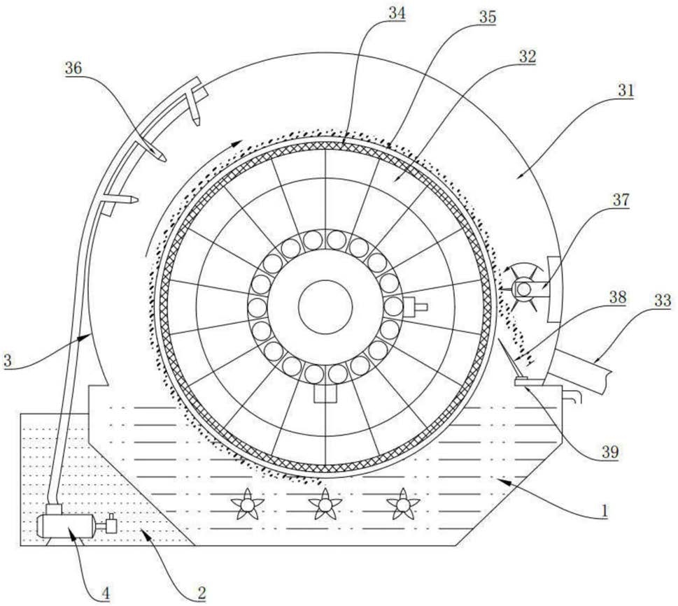1.一种转筒式过滤装置,包括料浆槽(1)以及中空的过滤筒(3),所述过滤筒(3)下半部浸没在所述料浆槽(1)内,所述过滤筒(3)内部腔构成过滤室(31),所述过滤室(31)中间设置空心的转筒(32),所述转筒(32)表面覆盖金属网(34)和滤布(35),其特征在于:所述过滤筒(3)内壁左上角设置多角度的冲洗系统(36),所述过滤筒(3)内壁右侧设置旋转式的刮料系统(37),所述刮料系统(37)下方设置由刮刀(38)以及底板(39)构成的卸料槽。
