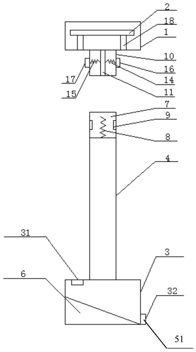 所述支撑杆的一端固定在所述底座中部,所述支撑杆的另一端开设有凹槽,所述凹槽中部垂直固定有第一弹簧,所述凹槽的侧壁上开设有相对的两个第一矩形通孔,所述第一弹簧的长度大于所述第一矩形通孔上端面距离所述凹槽底部的距离;所述外壳的底部设有与所述凹槽匹配的立柱,所述立柱为中空结构,所述立柱内垂直设有固定杆,所述立柱两侧分别设有相对的第二矩形通孔和第三矩形通孔,所述固定杆上水平固定有相对的第二弹簧和第三弹簧,所述第二弹簧远离固定杆的一端连接有与所述第一矩形通孔匹配的第一卡块,所述第一卡块穿过第二矩形通孔,所述第三弹簧远离固定杆的一端连接有与所述第一矩形通孔匹配的第二卡块,所述第二卡块穿过第三矩形通孔。