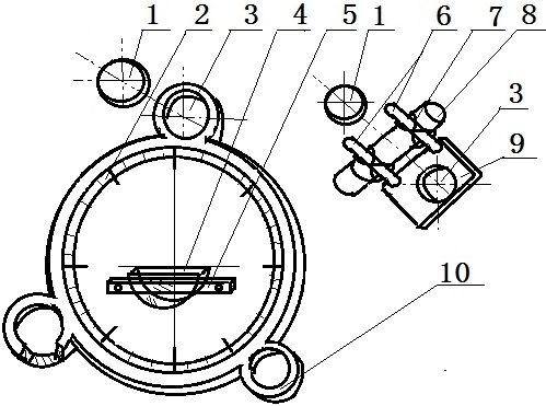 1.光学反折射定律的悬挂式演示装置,由圆形永磁铁、刻度圆盘、磁铁安放槽、光学元件、固定组件、有机玻璃条形夹板、螺栓、穿孔、螺孔、小立柱、牛皮绳、投影激光笔、立柱底座、小圆耳组成,刻度圆盘(2)上刻有角度刻度线、中分线、法线,其特征是:固定组件(5)旋接在刻度圆盘(2)的中下部、把光学元件(4)夹固在刻度圆盘(2)中央,刻度圆盘(2)的圆周上均匀分布三个小圆耳(10),小圆耳(10)与立柱底座(9)中央上开磁铁安放槽(3),槽底封闭,圆形永磁铁(1)安放在磁铁安放槽(3)中,立柱底座(9)边缘直立起两根小立柱(6),用牛皮绳(7)把投影激光笔(8)捆束在两根小立柱(6)上,立柱底座(9)成长方形,立柱底座(9)与小立柱(6)、磁铁安放槽(3)整体压制制作, 小圆耳(10)厚度比刻度圆盘(2)厚,两者的前表面相平齐,小圆耳(10)、刻度圆盘(2)、磁铁安放槽(3)也是整体压制制作。