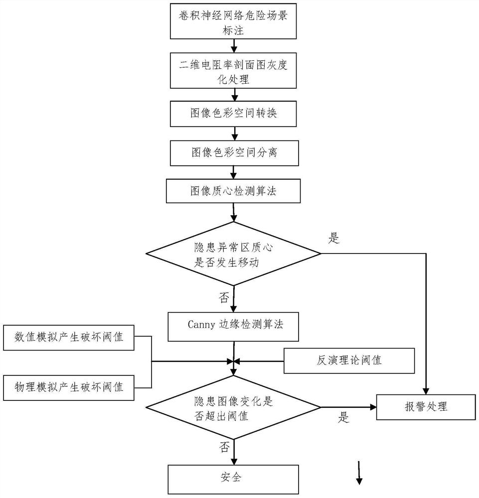 步骤六,进行图像色彩空间分离;然后进行电阻率图像对比,其中电阻率图像对比择一选用以下方式或两种方式按照先后顺序进行组合的方式进行:方式一,通过图像质心检测算法检测标本图像中隐患异常区质心是否发生变化:若是,则,报警处理,