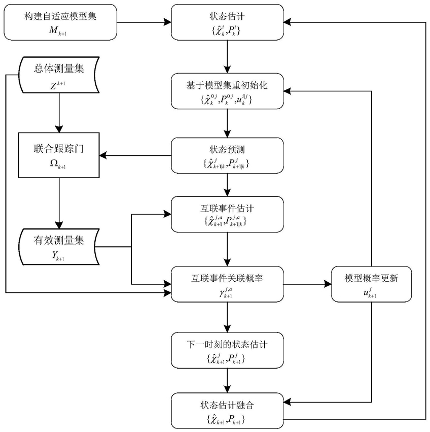4.3更新状态和协方差;首先对于扩展目标n,求解其k+1时刻模型 概率,扩展目标n的状态估计如下:其中 由公式(16)可得; 表示基于互联事件Aa,模型 当前有效测量以及总体测量下扩展目标n状态的后验估计,具体公式如下:其中 表示关联事件Aa中扩展目标n的新息矩阵;卡尔曼增益 和的协方差如下得: