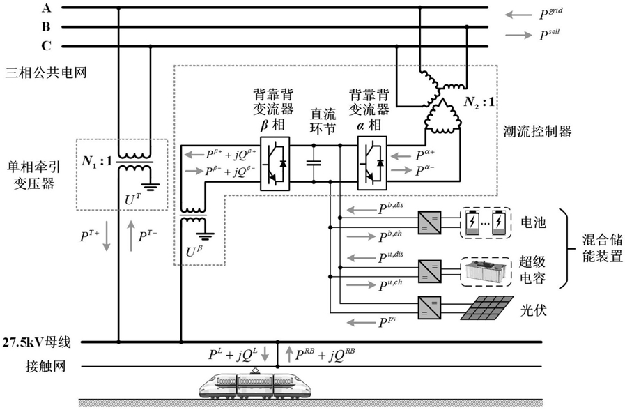 式中: 为由公共电网输入到牵引供电系统的有功功率, 为由牵引供电系统反馈至公共电网的有功功率, 分别为单相牵引变压器的正、反方向有功功率,分别为背靠背变流器α相的正、反方向有功功率, 分别为背靠背变流器β相的正、反方向有功功率;