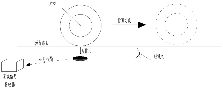 待判断路面出现裂缝后,对路面施加载荷,使载荷沿着行车方向以匀速移动经过第i个智能骨料的正上方,通过路面下方的无线信号发射器发射第i个骨料的产生的电压信号Vi,并通过无线信号接收器接收电信号,绘制Vi随载荷移动距离S的变化曲线,曲线出现突变处即为裂缝位置。