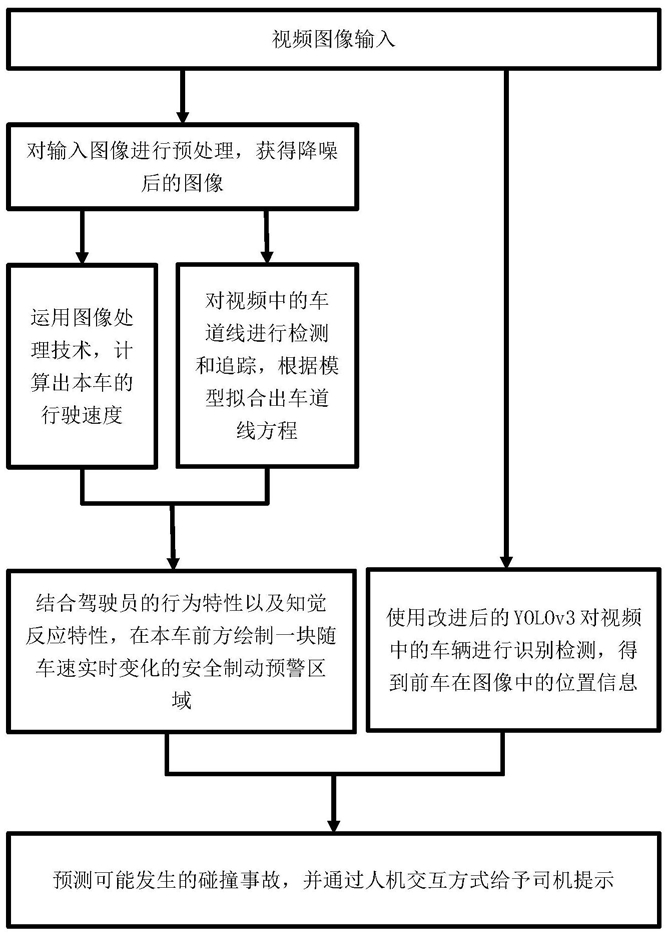 4.一种基于深度学习的车辆防碰撞预警系统,其特征在于,所述系统采用权利要求1所述的基于深度学习的车辆防碰撞预警方法,包括图像获取和预处理模块、多线程并行运算模块、车速检测模块、车道线检测模块、安全制动区绘制模块、车辆识别检测模块、碰撞预警模块,其特征在于,所述车速检测模块,运用图像处理技术,对连续多张图像进行分析,计算出当前车辆的行驶速度,与驾驶员的行为特性以及知觉反应特性相结合,得到车辆以该速度行驶时的紧急制动距离;所述车道线检测模块,运用边缘检测算法和霍夫直线检测算法得到车道线点的集合,将其拟合为最优的两条直线,并不断更新这些点的集合,对车道线进行追踪;所述安全制动区绘制模块,对图像中的像素距离和实际距离进行方程拟合,结合车道线检测结果和计算出的车辆紧急制动距离,在车辆前方绘制一块根据车速变化的安全区域,并在图像上进行可视化展示;所述车辆识别检测模块,使用改进后的YOLOv3算法,对视频中的车辆进行识别和检测,得到车辆在图像中的位置信息,并将结果保存在车辆信息队列中;所述碰撞预警模块,遍历车辆信息队列,结合绘制的安全制动区,对可能发生的交通碰撞事件进行预测。