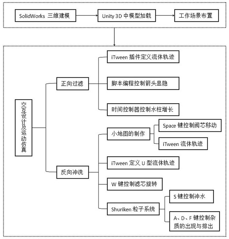 2.根据权利要求1所述的一种反冲洗过滤器交互式虚拟现实仿真方法,其特征在于,所述S1中:首先使用三维软件SolidWorks创建反冲洗过滤器三维模型;然后将该三维模型导入3dsMax软件中进行优化处理;在Unity中创建资源文件夹并分类,最后将优化后的三维模型文件放到相应的文件夹中。