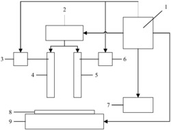 1.电流体驱动双喷头微滴喷射装置,包括二维移动平台(9),所述二维移动平台(9)上安装有柔性基板(8),所述二维移动平台(9)的侧面设置有CCD相机(7),所述二维移动平台(9)的上方设置有喷头A(4)和喷头B(5),所述喷头A(4)和喷头B(5)通过导线连接有驱动电源(2),所述喷头A(4)和喷头B(5)通过导气管分别连接到微量气泵A(3)和微量气泵B(6),所述驱动电源(2)、二维移动平台(9)、CCD相机(7)、微量气泵A(3)和微量气泵B(6)均与控制设备(1)相连接。