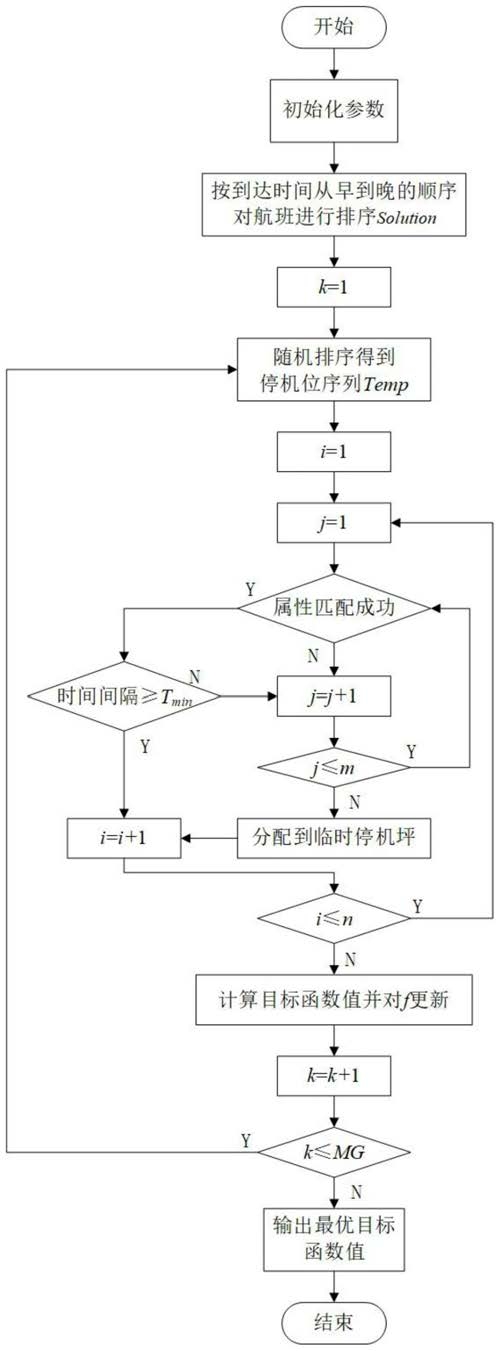 (四)采用结合启发式规则的智能算法进行求解得到可行方案,包括以下步骤:Step1:初始化算法、飞机数量n、停机位数目m、循环次数MG、初始化目标函数值f;