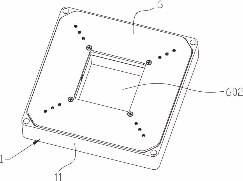 9.根据权利要求8所述的六自由度大行程无耦合大中空串并联压电微动平台,其特征是:所述的底座(1)的外围设有围挡(11),中央设有贯通所述的底座(1)的管状体(12),所述的围挡(11)间隙设于所述的第二平台(2)的下方,所述的管状体(12)间隙设于所述的第一平台(5)的下方,所述的动台面(6)设有与所述的管状体(12)轮廓相适配的第一中空孔(602),所述的第一平台(5)设有与所述的管状体(12)轮廓相适配的第二中空孔(55)。