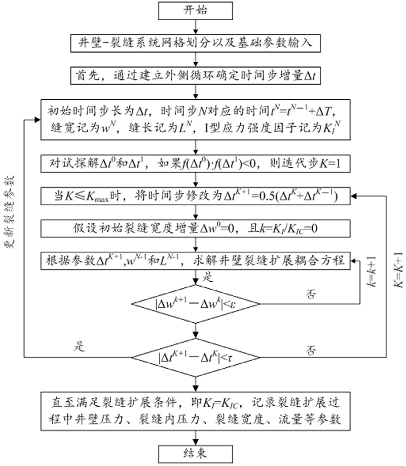 8.根据权利要求1所述的一种裂缝性地层井壁裂缝扩展压力预测方法,其特征在于,所述步骤五中,输入井眼、裂缝、地层以及流体参数后,基于步骤四给出的求解方法,计算恒流量注入过程中井壁裂缝的扩展行为,记录注入过程中井壁压力、裂缝内流体压力、裂缝开度、裂缝内流量参数的响应特征;通过对比裂缝开度‑裂缝长度变化曲线与井壁压力‑时间响应曲线,确定出井壁裂缝的扩展压力,即井壁裂缝开始扩展时对应的井壁压力。