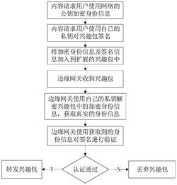 1.一种信息中心网络中内容请求用户的身份认证方法,其特征在于:包括扩展兴趣包的结构,在原有的兴趣包结构中增加两个字段:加密身份和请求用户签名,分别用于保存加密后的用户身份标识以及对发起兴趣请求的用户签名信息;内容请求用户在每个发送的兴趣包内嵌入IBE加密后的身份标识和IBS签名信息;