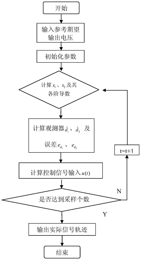 在步骤(1)中,所述初始化系统状态及控制参数的过程为:定义状态变量x1=v0-vref, 则带有匹配扰动和非匹配扰动降压型直流变换器误差动态方程可表示成如下形式:其中,vref为参考输出电压,且为正常值; 为匹配扰动,称之为第二匹配扰动,即