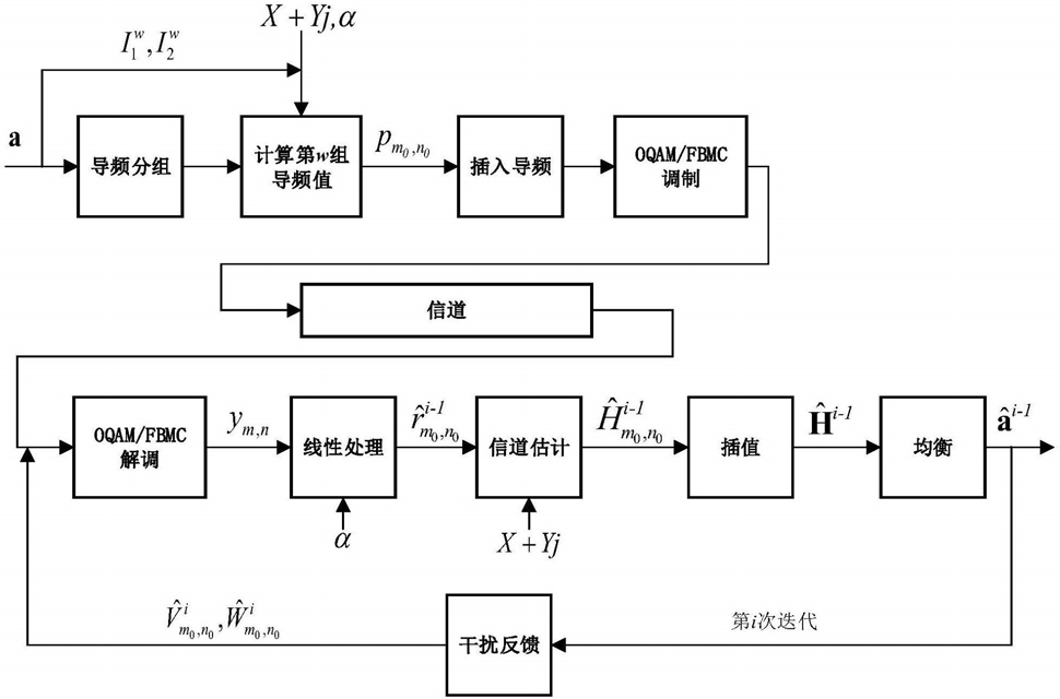 别表示(m0,n0)和(m0,n0+1)处通过解调的导频信息;α表示导频对中两个导频的权重因子;r表示第i次干扰修正迭代优化后的预定义导频值,r为发送端设定的预定义导频值,即r=X+Yj,X和Y为两个常实数; 为第i次干扰修正迭代优化时对信道系数在时域上快速变化导致接收方和发送方信息不对称带来的干扰的估计值, 为第i次干扰修正迭代优化时对分组导频计算引起的干扰的估计值, 和 分别表示第i‑1次干扰修正迭代后优化时得到的(p,q)和(m0,n0)处的估计的信道系数;ap,q表示第i‑1次干扰修正迭代后第p个子载波的第q个符号上估计的传输数据信息, 和 分别表示时频点(p,q)数据对时频点(m0,n0)和(m0,n0+1)处产生干扰的系数, 和 分别表示对 和 产生干扰的周围数据的位置的集合,Ωw为计算第w组导频对的实际导频值时除第w组导频对的实际导频值之外其他未计算的导频对组位置的集合。