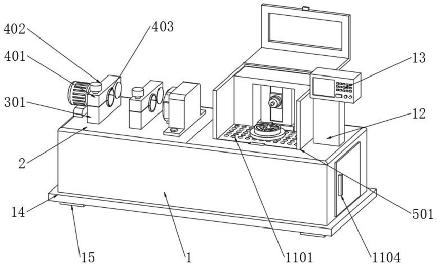 7.根据权利要求1或4所述的一种数控机床的主轴误差修正及检测一体化装置,其特征在于:所述修正室(501)底端安装有除渣组件(11),所述除渣组件(11)包括滤板(1101)、漏斗(1102)、吸管(1103)和除渣门(1104);